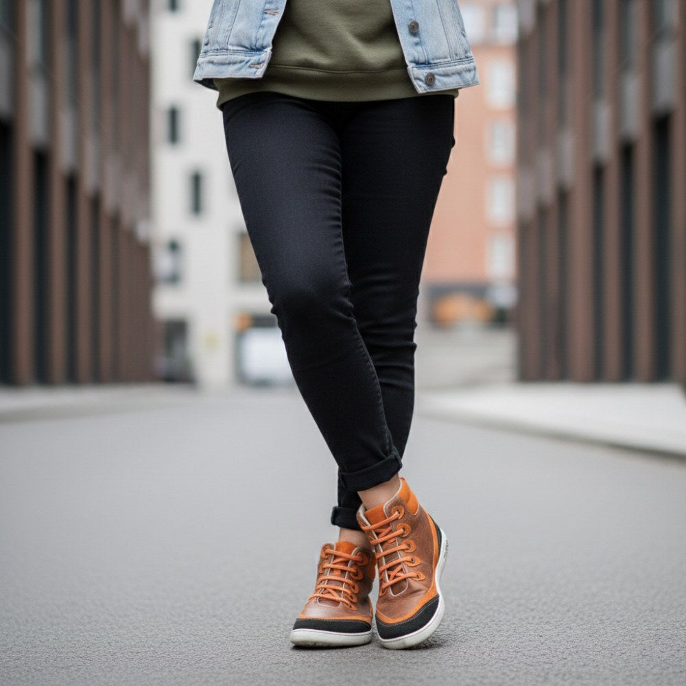 This mid-cut barefoot shoe inspires with its modern look and definitely stands out from the crowd. The striking orange is an exciting symbiosis with the earthy brown tone. Fine details such as the hand -sewn patches on the laces give our cinco a cheeky look.