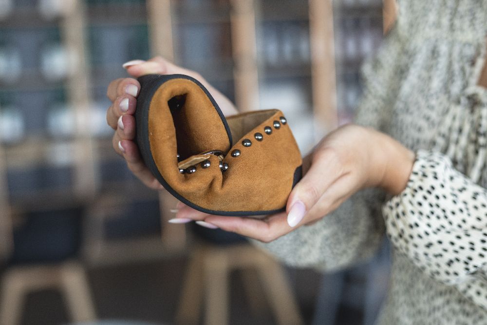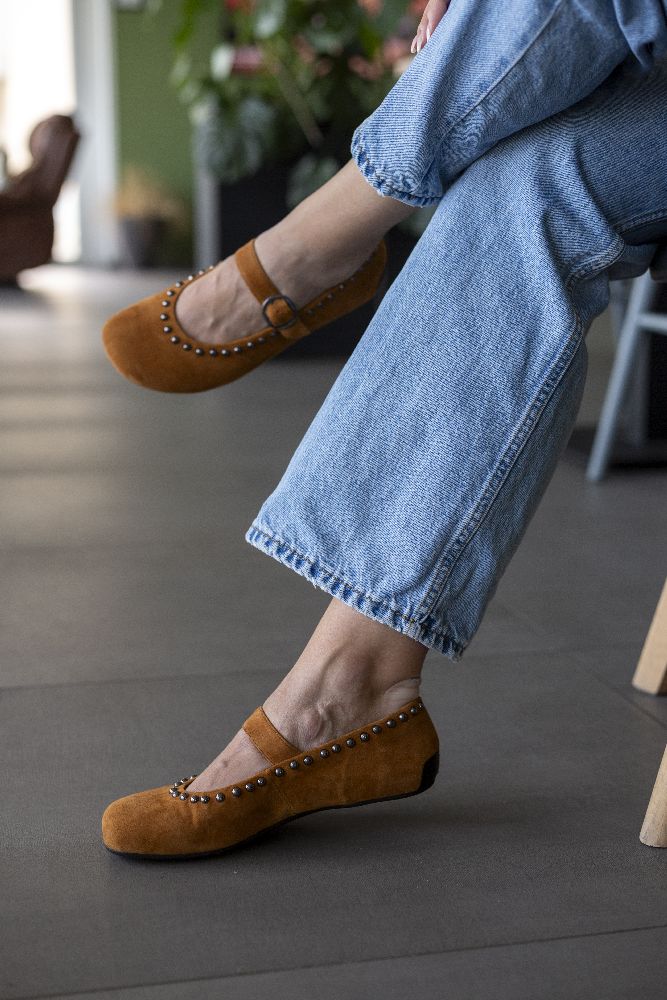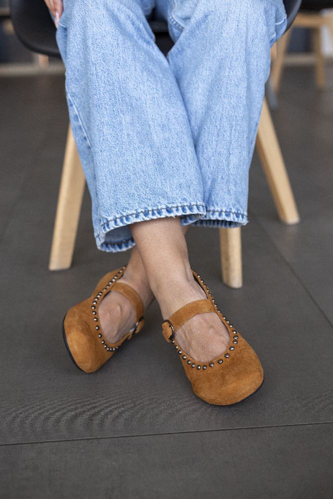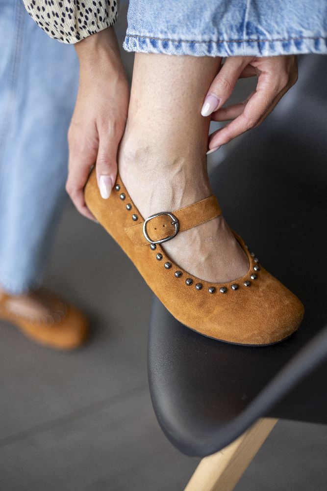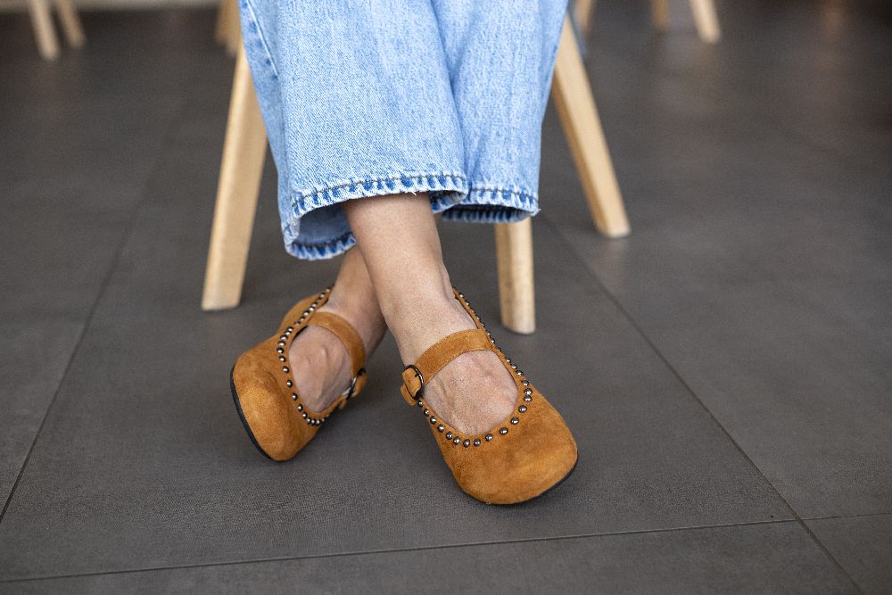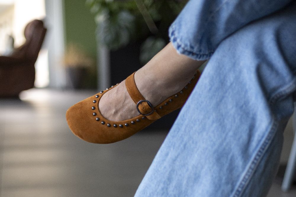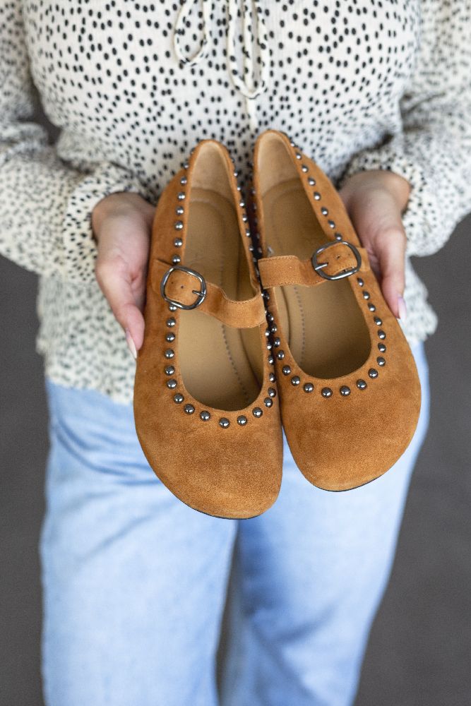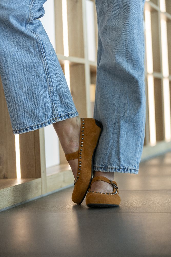 Our Dieqo Brown is our brand new ballerin shoe made of brown suede. This piece of jewelry is lined with round rivets and gives every outfit a touch of glamor, without foregoing the incredible comfort that you are used to from our barefoot shoes.