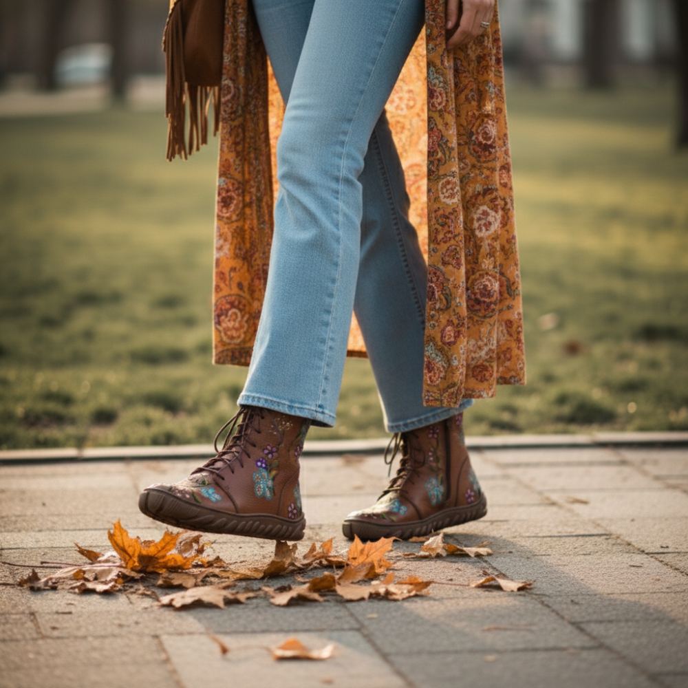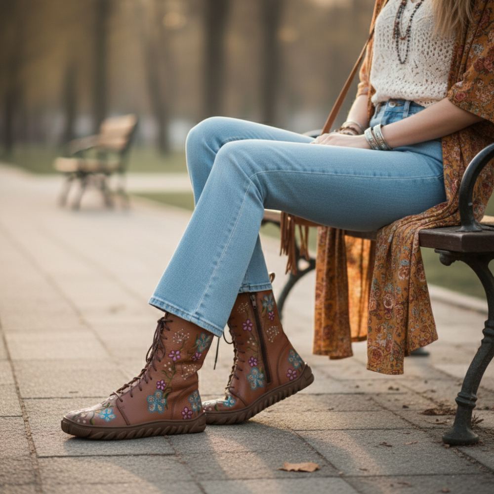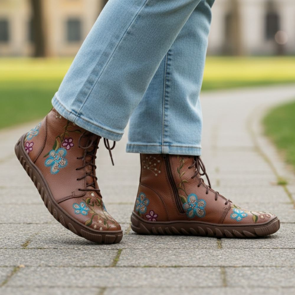 These boots in a warm brown tone, decorated with a unique flower power design, are not only an optical highlight, but also a symbol of freedom and naturalness. The premium nappa leather ensures a high -quality look, while the zipper on the base and the lacing enable an individual fit and easy tightening.