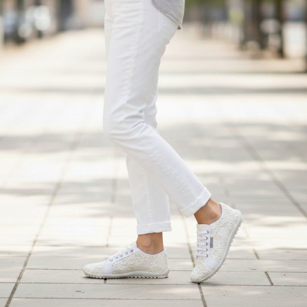 Qelly is the white sneaker, which works particularly feminine with its fine embroidery. With this barefoot shoe you have found your unique companion for the warmer days of the year.