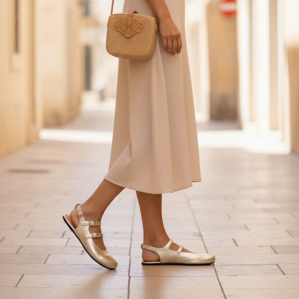 Our Qomeet Gold combines glamor and comfort in an openly cut ballerin shoe. With the adjustable straps above the clamp and the additional strap at the back, our Qomeet Gold offers a perfect fit and a secure hold with every step.