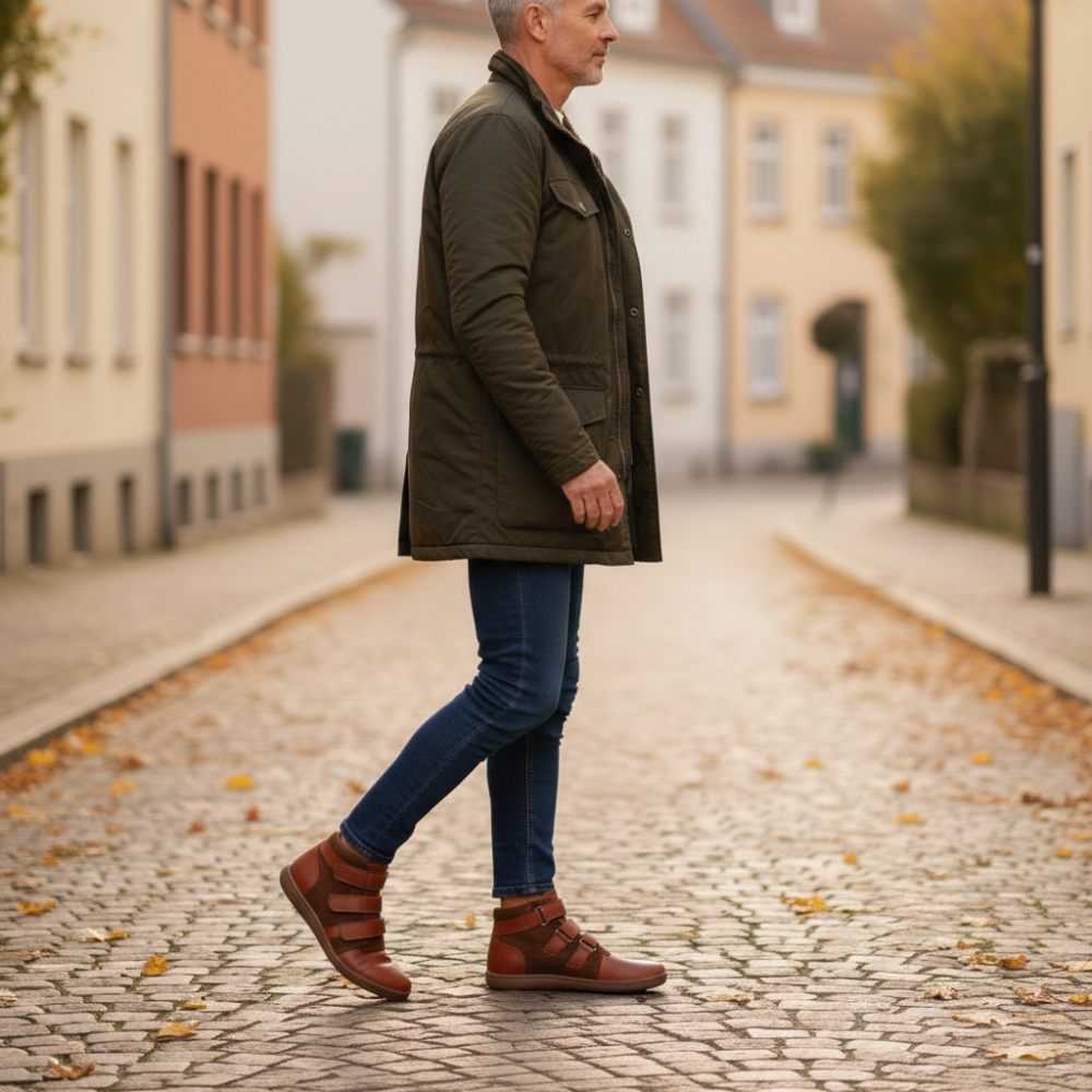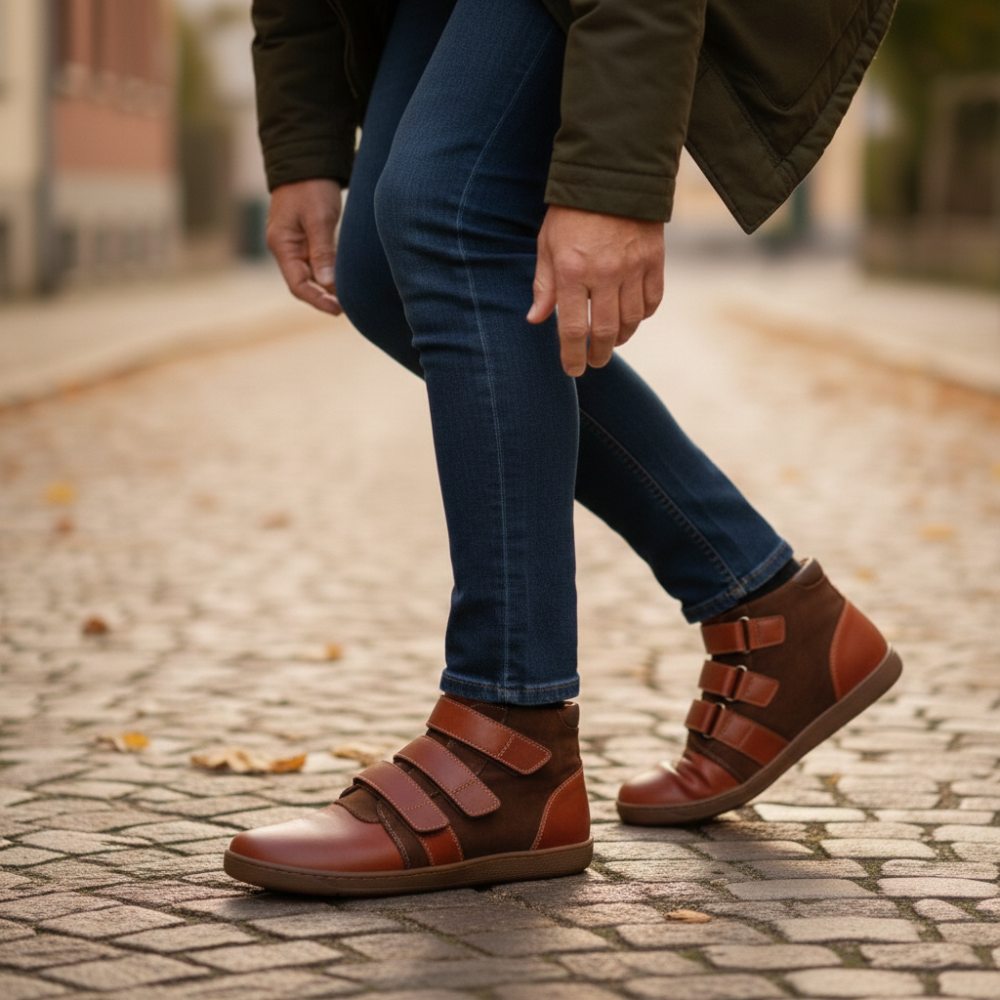 Qooper is the half -high barefoot shoe, which looks particularly noble due to its brown leather and is simply incredibly comfortable with the practical Velcro fastener.