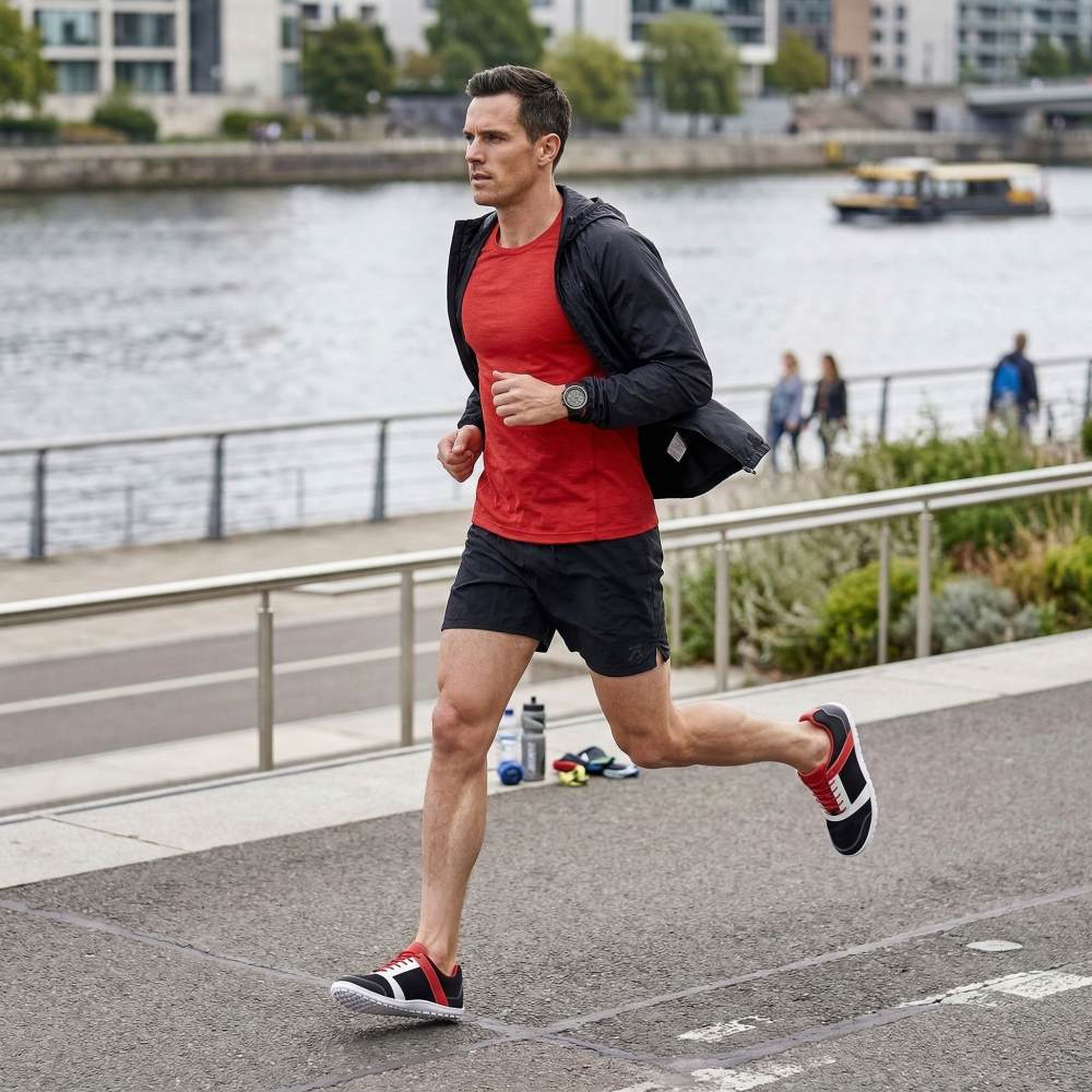 The leather recording at the front of the toes and at the back of the heels protect the sensitive areas, which are particularly stressed in all sporting activities. They also give the sports shoe expression and identity. The combination of four colors is absolutely coherent - no too much, no too little nuances. Due to the wafer -thin sole you have the barefoot feeling while running in our Zarqa and are still well protected. Your feet will thank you.